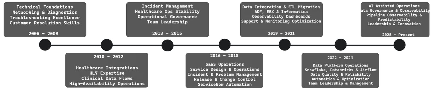 Driving data reliability and operational excellence through proactive, prevention-first support strategies built on 19+ years of global experience in Data Engineering and Operations, across Healthcare, QSR, Retail, and OGC domains.